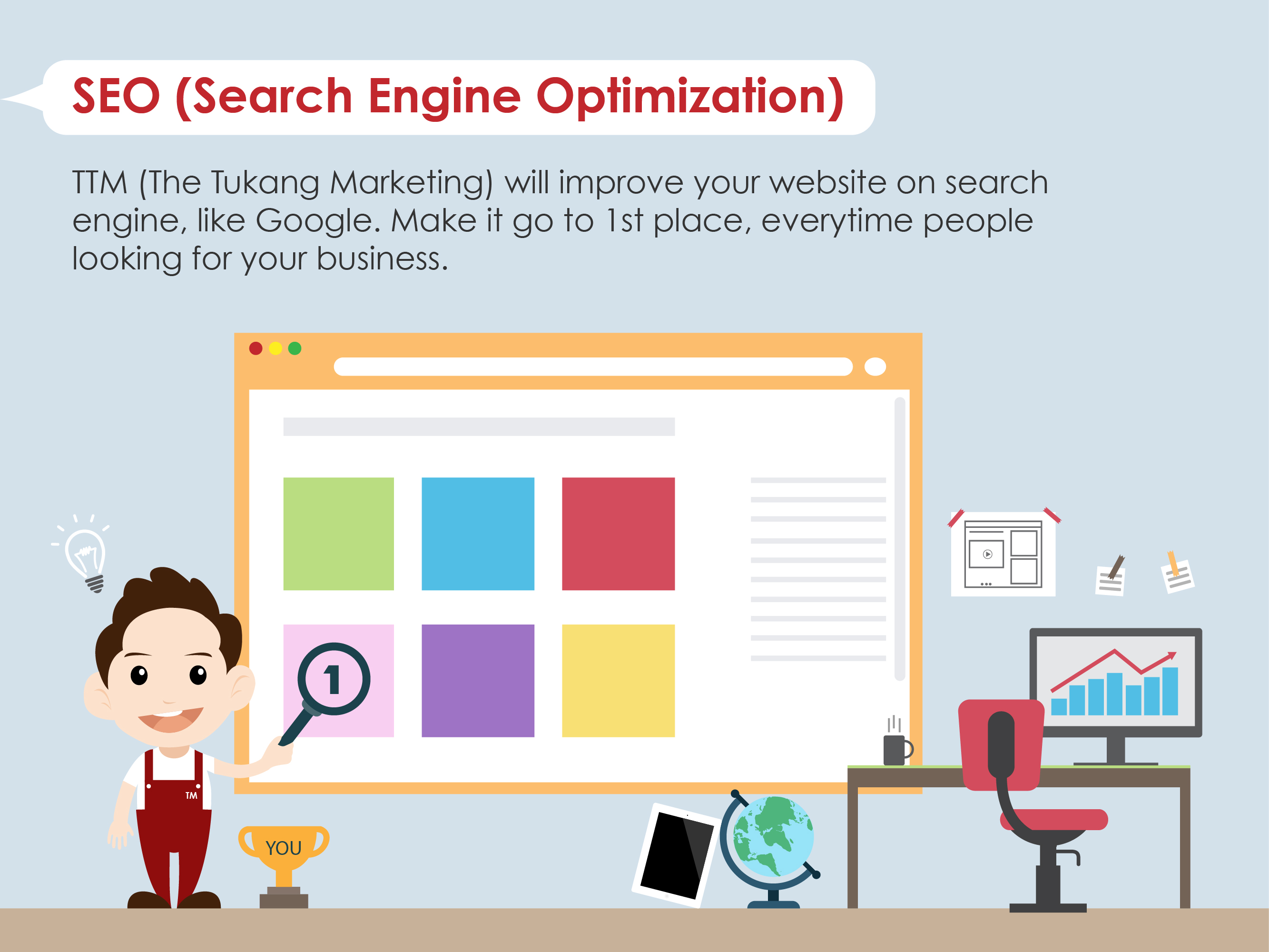 Search Engine Optimisation or we called it SEO is a method to increase your website rank from bottom to the first page of search engine, like Google, Yahoo, Bing, or even Duck Duck Go. What we do are optimise your website's rank and visibility, so every time people looking for you business keyword, they will find your website on top of Google 1st page. Cool right?